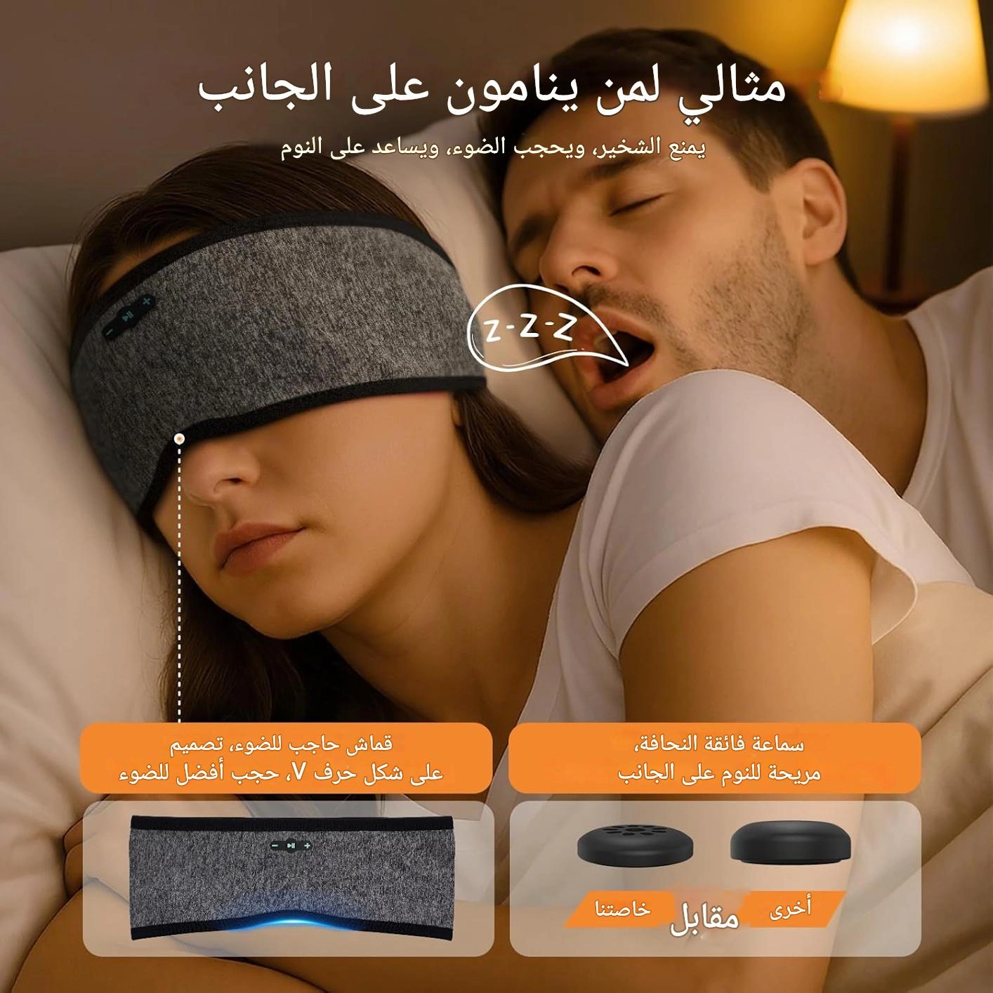 قناع نوم ذكي بسماعات بلوتوث مدمجة - ناعم على وجهك، ما تحس فيه، وظلام كامل على عيونك.